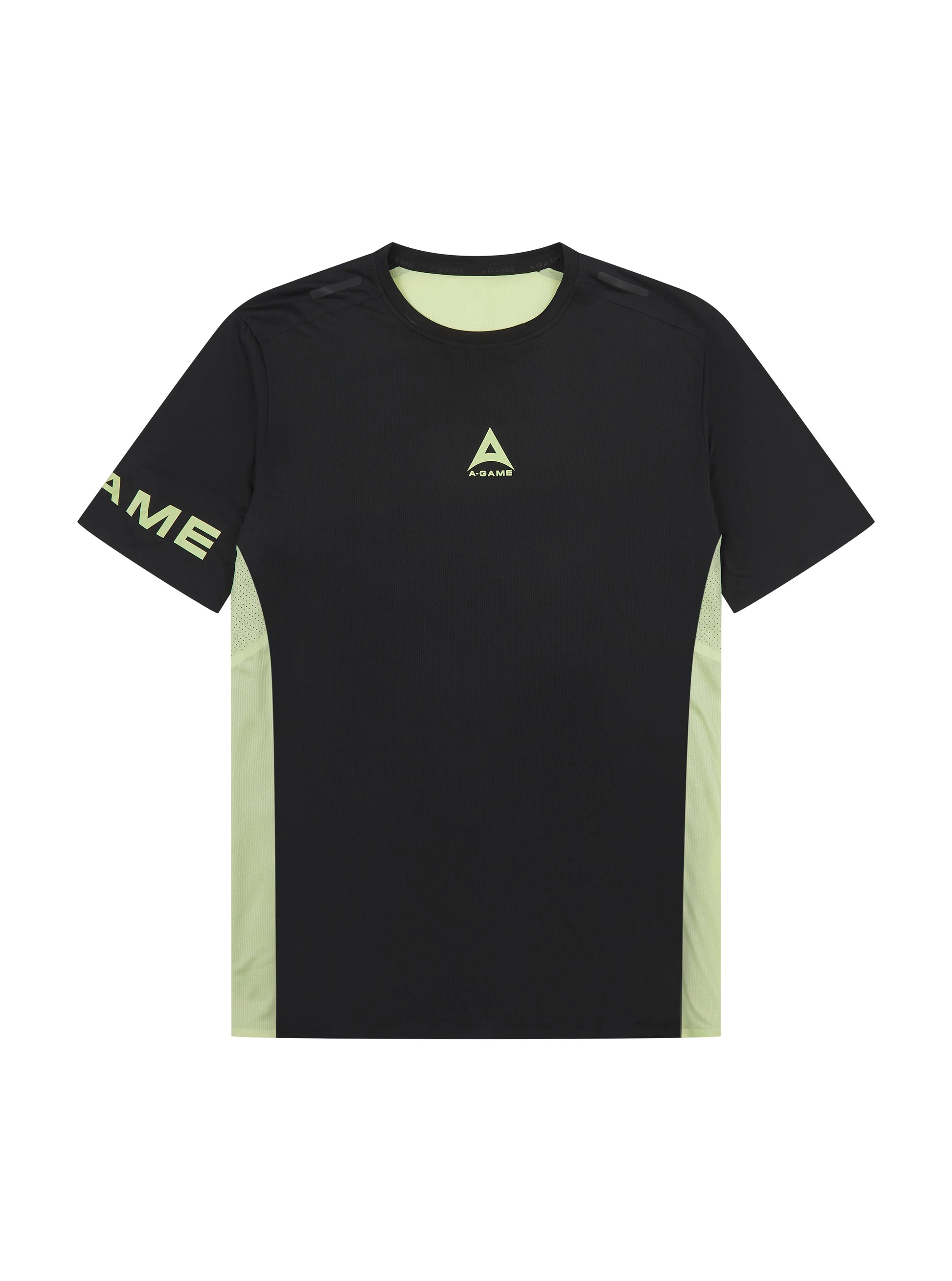 MENS A-GAME PERFORMANCE TRAINING TSHIRT in black and lime. Woven from 100% recycled lightweight polyester with antibacterial and sweat-wicking properties.