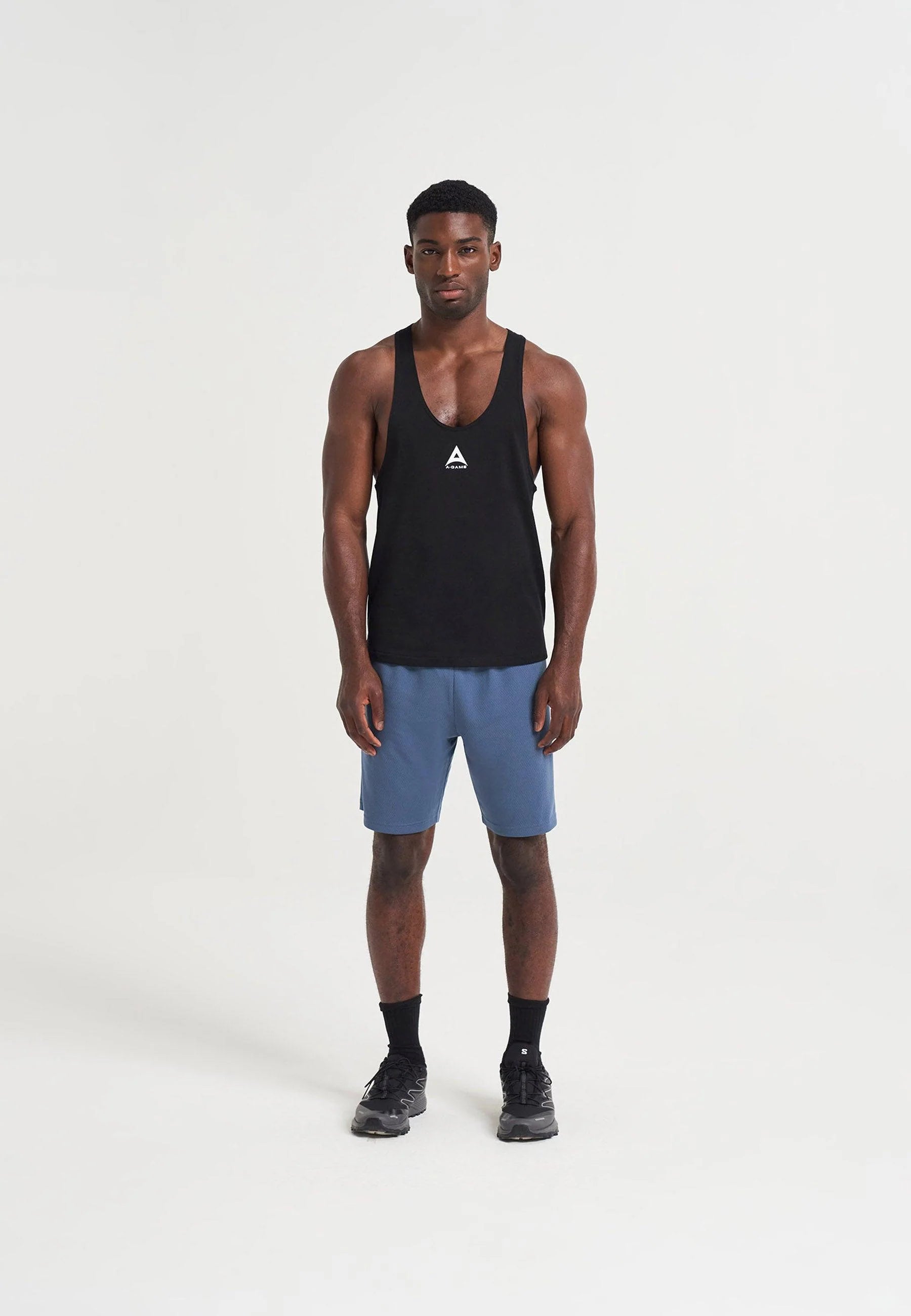 MENS A-GAME STRINGER VEST in pure black.